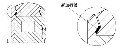 骨架密封厚度15mm,拆下壓蓋用車床將骨架密封擋邊車薄5mm,壓蓋密封槽深度由18mm加深到23mm(見圖4)。此法使得骨架密封在高速軸上的安裝位置向外移動5mm,避開高速軸上的溝槽。經(jīng)此處理,解決了漏油問題,可以正常生產(chǎn),等到計(jì)劃檢修停機(jī)時,再徹底處理高速軸上的溝槽。